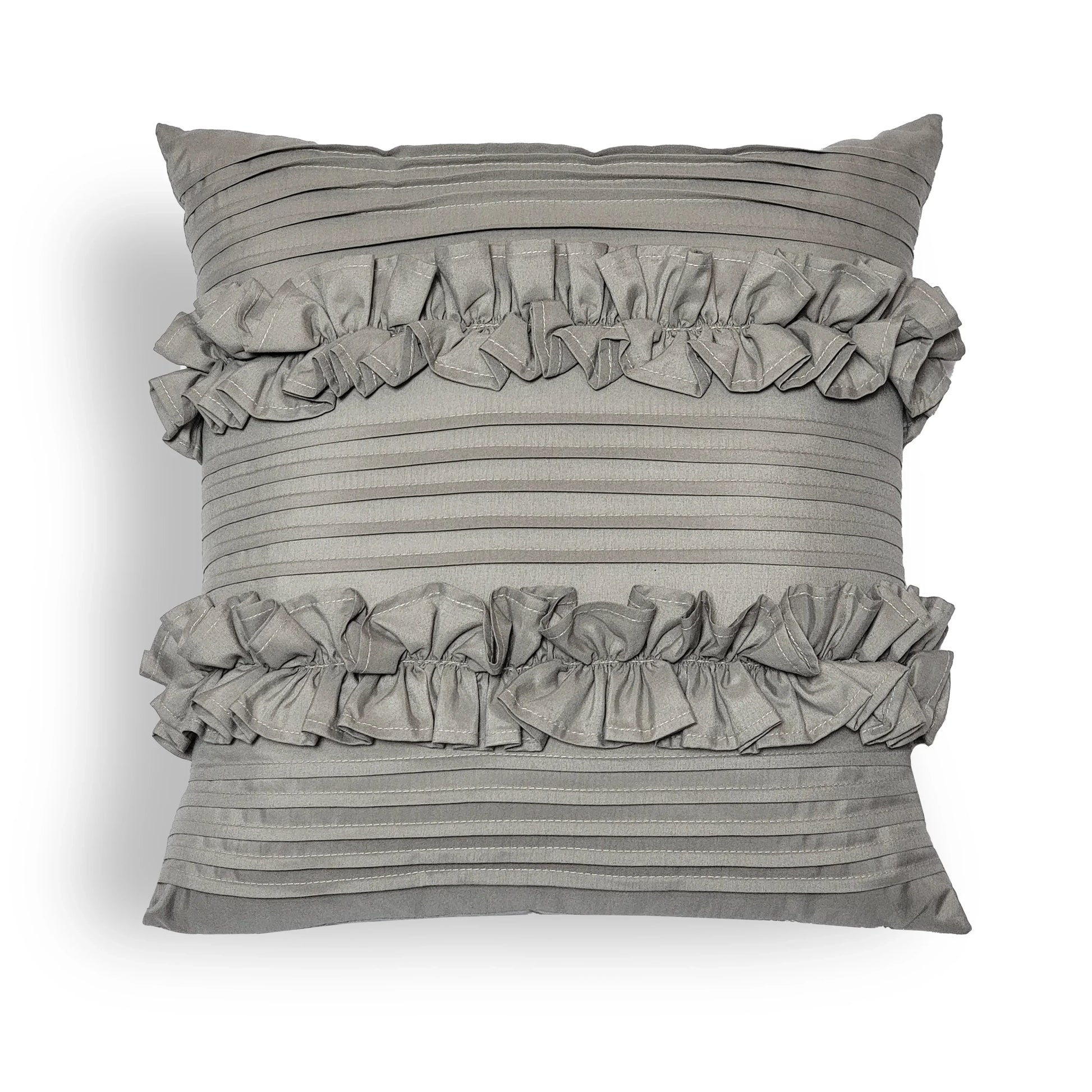Description: Stylish and textured, this silver grey cushion blends structured pleats with playful ruffles perfect for any modern living space.